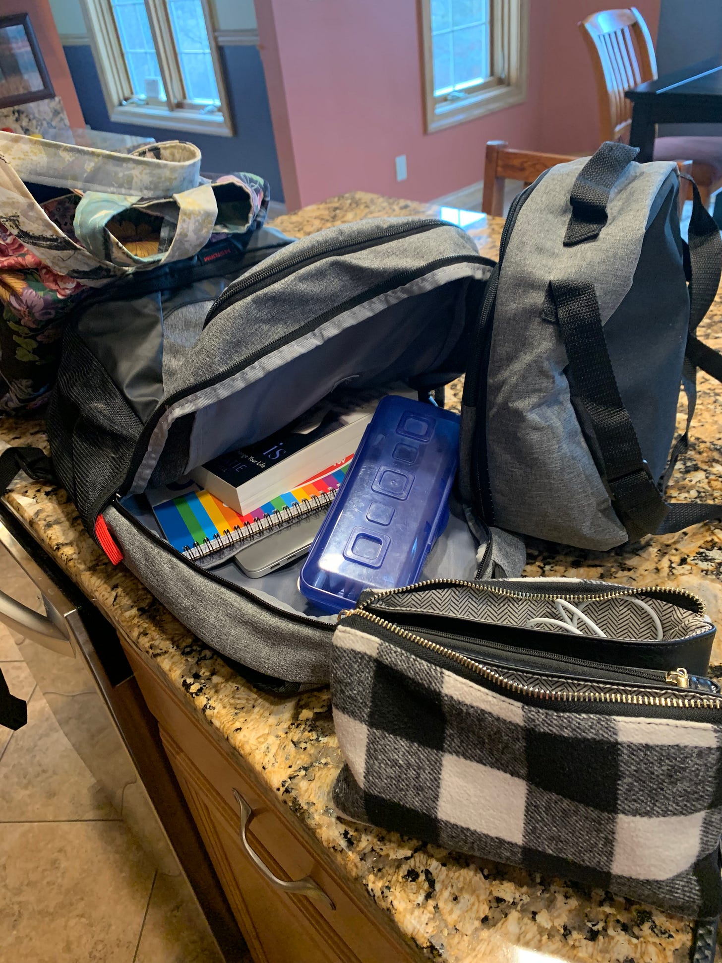 Power cords, fancy crayons, how to draw a horse instructions, three books, and every piece of cancer related material she’s been given. Check.