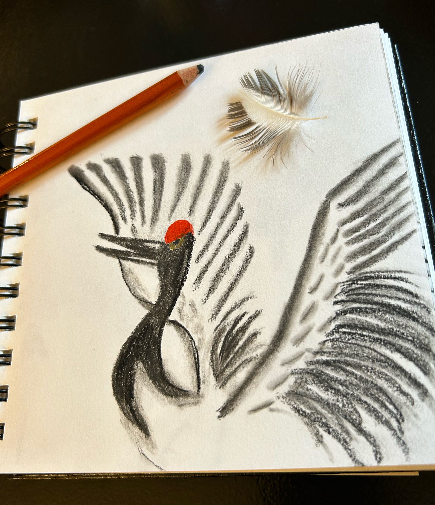 The crane story is amazing! The sketch ✍🏼, the addition of the feather 🪶 as a mixed media addition AND Dances With Wolves...