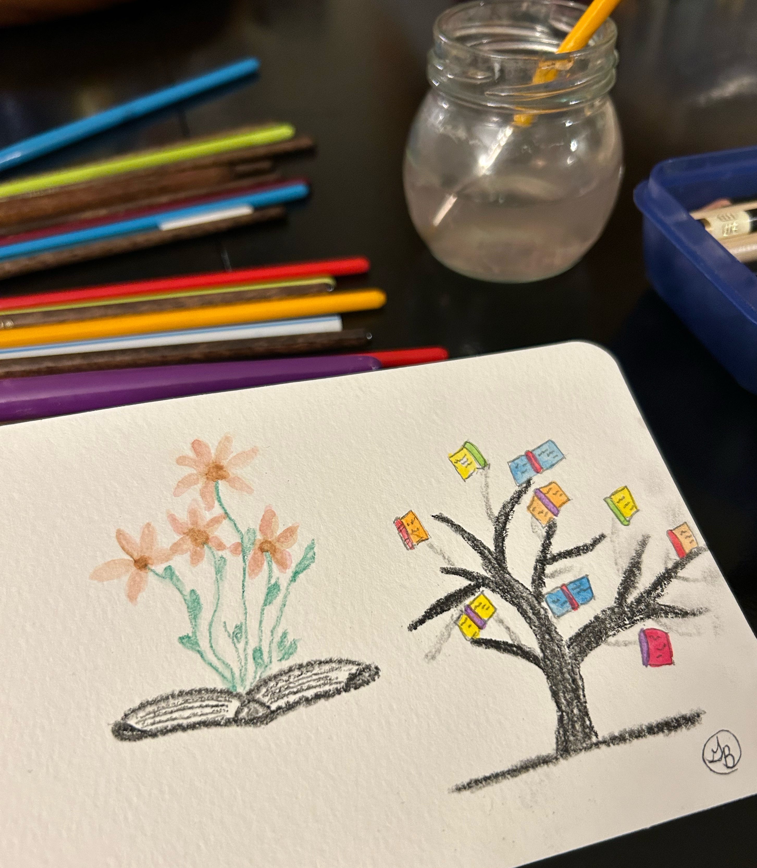 Nia folded a paper into tiny squares and made notes for images and pages while Thalia spilled props onto images and eyed them for appeal.