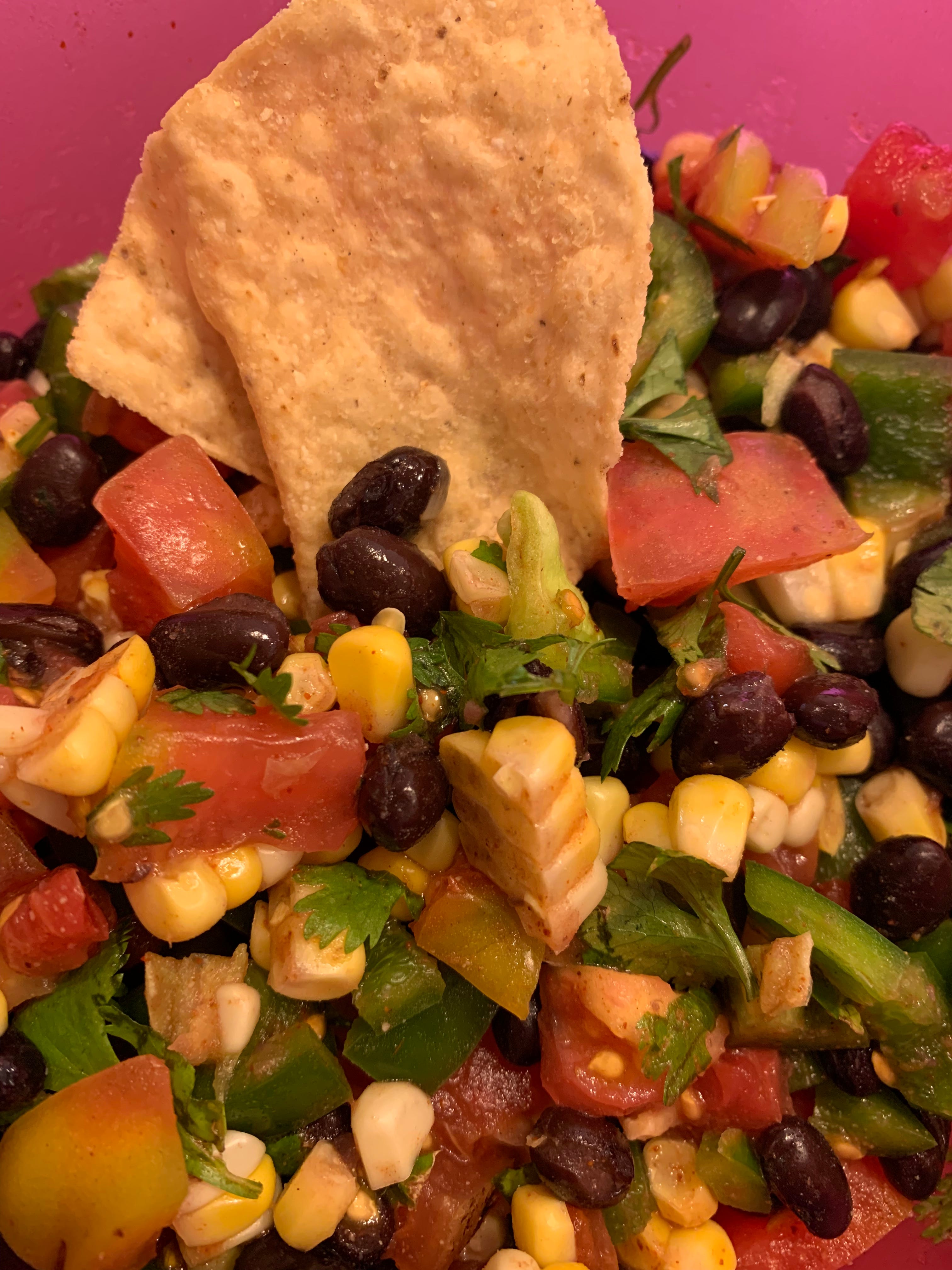Thalia crunched and swallowed a mouthful of chip, tomato, corn, black bean, green pepper, and cilantro. “Holy moly… This is delicious!” Crumbs and juice sprayed onto the table.